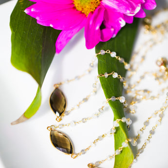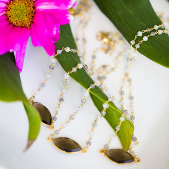 The Smoky Quartz, Sunstone, and Labradorite Pebble Gem Necklace layers beautifully with other necklaces and is eye-catching on its own. Smoky Quartz is known for grounding and anchoring. This gemstone will open your eyes to the power of now, giving you the clarity to let go of what no longer serves you. About 16" in length.