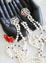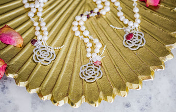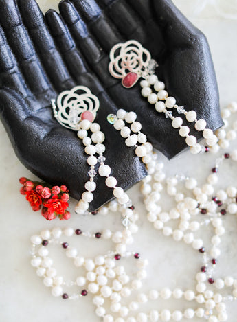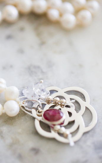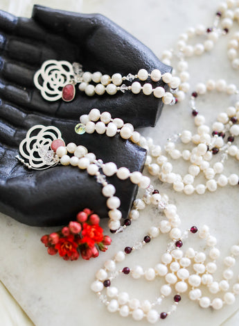 Details:: The Power Of She Mala is crafted with 8mm Freshwater Pearls, faceted 4mm Rubies, Herkimer Diamonds, Swarovski Crystals, and a .925 Sterling Silver pendant. It's hand-knotted on white silk thread. Hangs approx. 19".