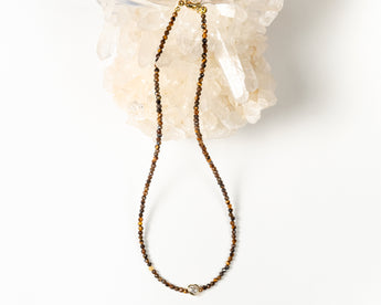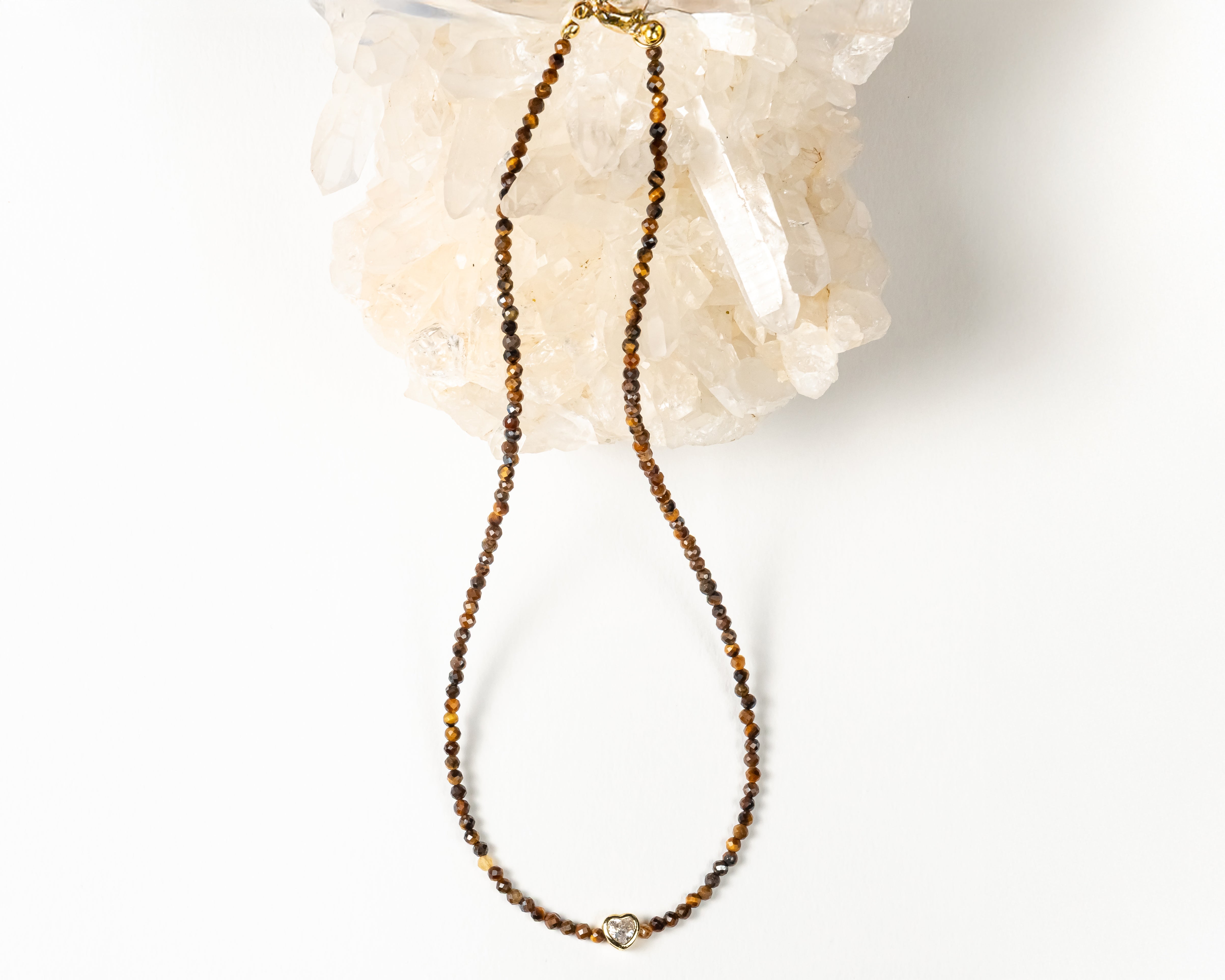 Petite Chokers are made with genuine semi-precious gemstones and come with an assortment of gems and gold-plated charms. They are about 15” long and hang at or slightly below the collarbone. The heart is a universal symbol of love and compassion, offering gentle emotional protection and inviting connection and healing.