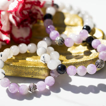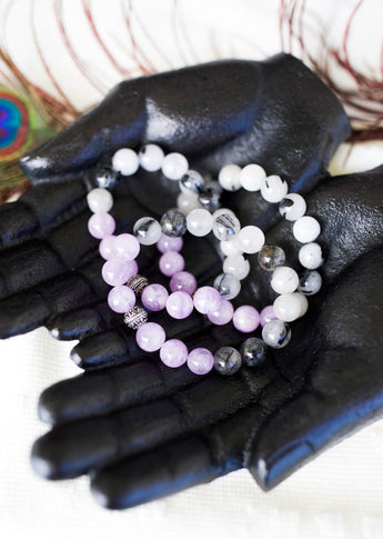 The Master Manifestor Luxe Bracelet is crafted with 10mm Lavender Amethyst and Tourmalinated Quartz. It's available in standard 7 inches in size.