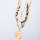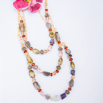 The Artiste Luxe Necklace features an array of genuine gemstones like Labradorite on an Electroplated Gold chain. This Luxe Necklace layers beautifully with other necklaces and is eye-catching on its own. About 18" in length and is adjustable.