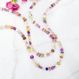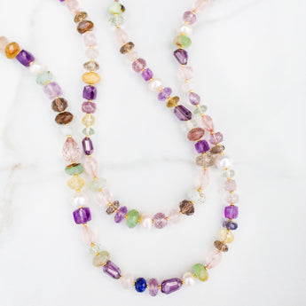 The Eclectic Luxe Necklace features Amethyst, Freshwater Pearls, and other high-quality gems. This Luxe Necklace layers beautifully with our Electroplated Gold necklaces and is eye-catching on its own. About 18" in length.