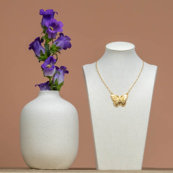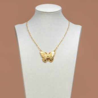 The Flourish Butterfly Necklace is crafted on an Electroplated Gold chain. This Luxe Necklace layers beautifully with other necklaces and is eye-catching on its own. About 18" in length and is adjustable.
