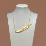 The Flourish Feather Necklace is crafted on an Electroplated Gold chain. This Luxe Necklace layers beautifully with other necklaces and is eye-catching on its own. About 16" in length and is adjustable.