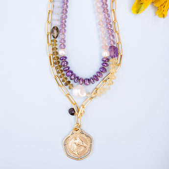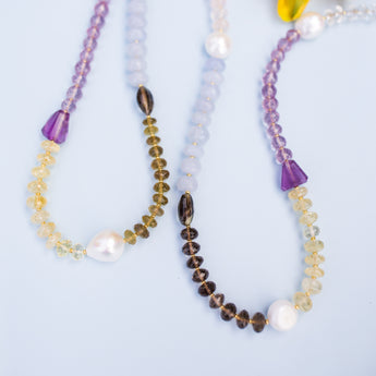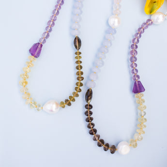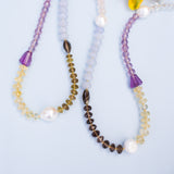 The Geometric Luxe Necklace features Amethyst, Citrine, Freshwater Pearls, Aquamarine, and Smoky Quartz. This Luxe Necklace layers beautifully with our Electroplated Gold necklaces and is eye-catching on its own. About 18" in length.