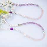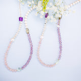 The Girlie Luxe Necklace features Amethyst, Clear Quartz, Freshwater Pearls, and other high-quality gems. This Luxe Necklace layers beautifully with our Electroplated Gold necklaces and is eye-catching on its own. About 18" in length.