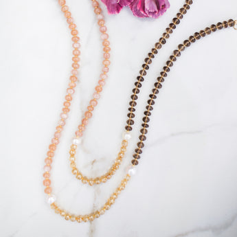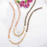 The Grounded Luxe Necklace features Sunstone, Citrine, Freshwater Pearls, and Smoky Quartz. This Luxe Necklace layers beautifully with our Electroplated Gold necklaces and is eye-catching on its own. About 18" in length.