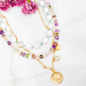 The Mermaid Luxe Necklace is crafted with Freshwater Pearls. This Luxe Necklace layers beautifully with our Electroplated Gold necklaces and is eye-catching on its own. About 18" in length.