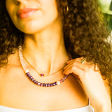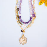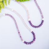 The Purple Flow Luxe Necklace is crafted with Amethyst, Freshwater Pearls, and Clear Quartz. This Luxe Necklace layers beautifully with our Electroplated Gold necklaces and is eye-catching on its own. About 18" in length.