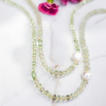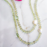 The Seafoam Luxe Necklace is crafted with Aventurine and Freshwater Pearls. This Luxe Necklace layers beautifully with our Electroplated Gold necklaces and is eye-catching on its own. About 18" in length.