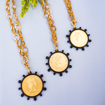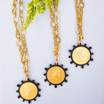 The Queen Luxe Necklace is crafted with Electroplated Gold. This Luxe Necklace layers beautifully with other necklaces and is eye-catching on its own. About 18" in length and is adjustable.