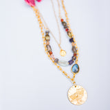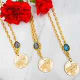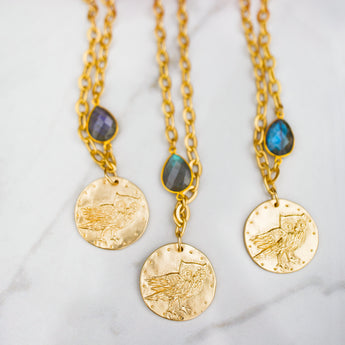 The Wisdom Luxe Necklace features Labradorite and is crafted on an Electroplated Gold chain. Owls symbolize inner wisdom, change, transformation, intuitive development, good luck, and self-actualization. This Luxe Necklace layers beautifully with other necklaces and is eye-catching on its own. About 18" in length and is adjustable.