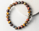 The Men's Matte Tiger's Eye Regular Bracelet is made with 8mm beads on a high-quality stretchy cord. It's available in a standard 7.5-inch size.