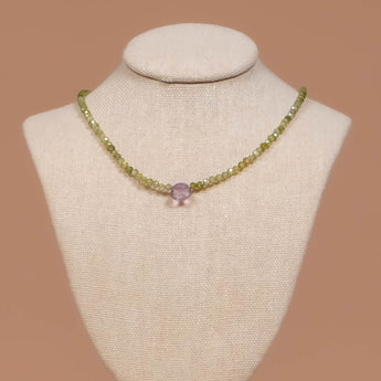 Petite Chokers are made with genuine semi-precious gemstones and come with an assortment of gems and gold-plated charms. They are about 15” long and hang at or slightly below the collarbone. Amethyst symbolizes spiritual protection, clarity, and the calming of the mind, supporting balance and inner peace.