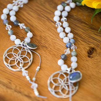 Details:: Enlightenment Mala is crafted with 8mm labradorite, Moonstone, Swarovski Crystal accents, and a silver-plated Seed Of Life pendant. It's hand-knotted on beige silk thread. Hangs approx. 22’